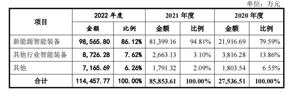从产业类型上来看,思客琦有新能源智能设备,其他行业智能设备、工业数字化软件与服务三大业务。其中,新能源智能设备是主要营收业务。招股书显示的,新能源智能设备2020、2021、2022年的收入占比分别为79.59%、94.81%、86.12%。
